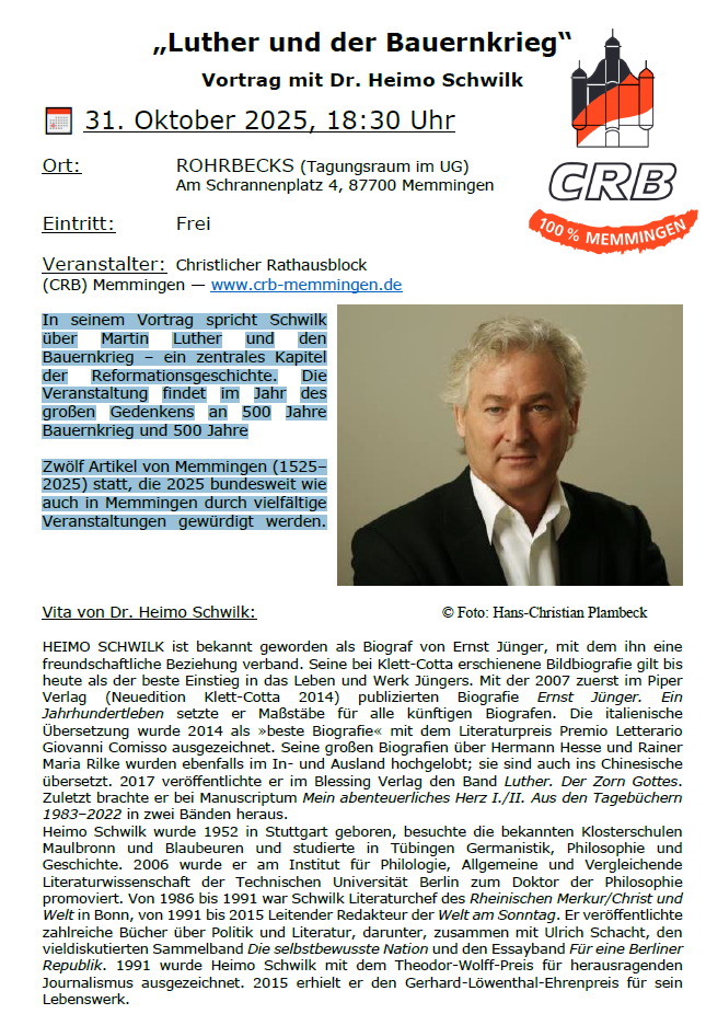 In seinem Vortrag spricht Schwilk über Martin Luther und den Bauernkrieg – ein zentrales Kapitel der Reformationsgeschichte. Die Veranstaltung findet im Jahr des großen Gedenkens an 500 Jahre Bauernkrieg und 500 Jahre